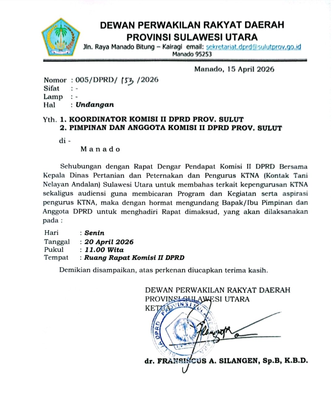 Manado, BA OBER NEWS.Lewat Undangan Dari Ketua DPRD Sulut Nomor : 005/DPRD/153/2026 Tanggal, 15 April 2026 yang ditandatangani langsung oleh Ketua DPRD Sulut Bapak dr.Fransiscus A.Silangen, SPb.,K.B.D. adakan Rapat Dengar Pendapat (RDP), dengan Dinas Pertanian dan Peternakan Sulut serta Pengurus Kontak Tani Nelayan Andalan (KTNA) Sulawesi Utara untuk membahas terkait dengan Kepengurusan KTNA Sulawesi Utara sekaligus audensi guna membicarakan program dan kegiatan serta aspirasi Pengurus KTNA Sulawesi Utara.